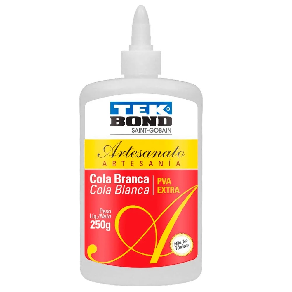 TekBond Cola branca PVA Extra Artesanato 250g. Adere a diversos materiais como: fórmica,aglomerados, laminados, Duratex, papel, papelão, superfícies porosas em geral portanto atende tanto aos artesãos como aos marceneiros.Pode ser utilizada nos processos convencionais de colagem: prensagem a frio e a quente e ainda pode ser lavável. Após secagem o produto apresenta aparência transparente e brilhante. Tempode secagem aproximadamente 4hs.