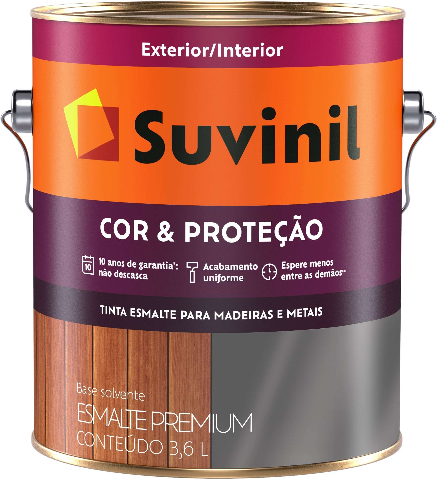 Suvinil Esmalte Cor e Proteção é a melhor tinta para pintar madeira e metal. Versátil de verdade, ela renova superfícies de dentro e fora da sua casa, combinando acabamento, cobertura e uma fórmula com silicone que não deixa sujeiras. Sua 2ª demão pode ser aplicada após 45 minutos, mesmo que a 1ª não esteja seca. Suvinil Esmalte Cor e Proteção é prático, fácil de aplicar, não descasca e com garantia de 10 anos.