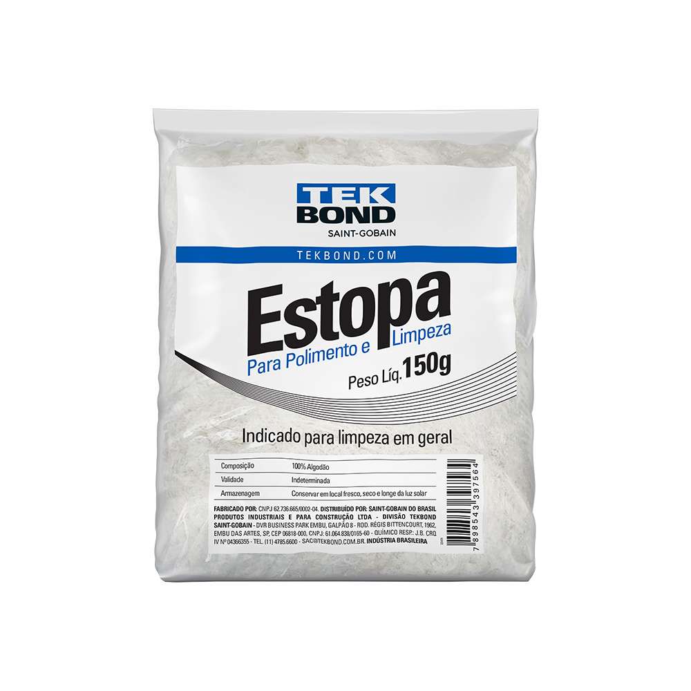 A Estopa TekBond é feita 100% de algodão branco, que é um tecido de alta qualidade e macio. Além disso, a Estopa é produzida por meio do aproveitamento de fios de algodão, o que é extremamente importante para a redução da poluição do meio ambiente, pois diminui o descarte dos tecidos.