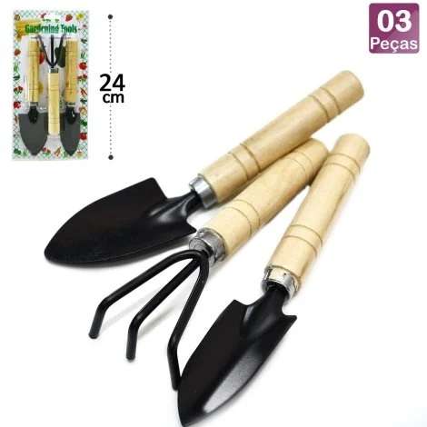 Kit de jardinagem 3 peças metal cabo de madeira. Perfeito para o cuidado de pequenos jardins e mini hortas, pode ser usado também como artigo decorativo. Composto por três peças leves e práticas, são produzidos em metal e cabo em madeira. Cada peça possui suas especialidades e servem uma para cada exigência na jardinagem.